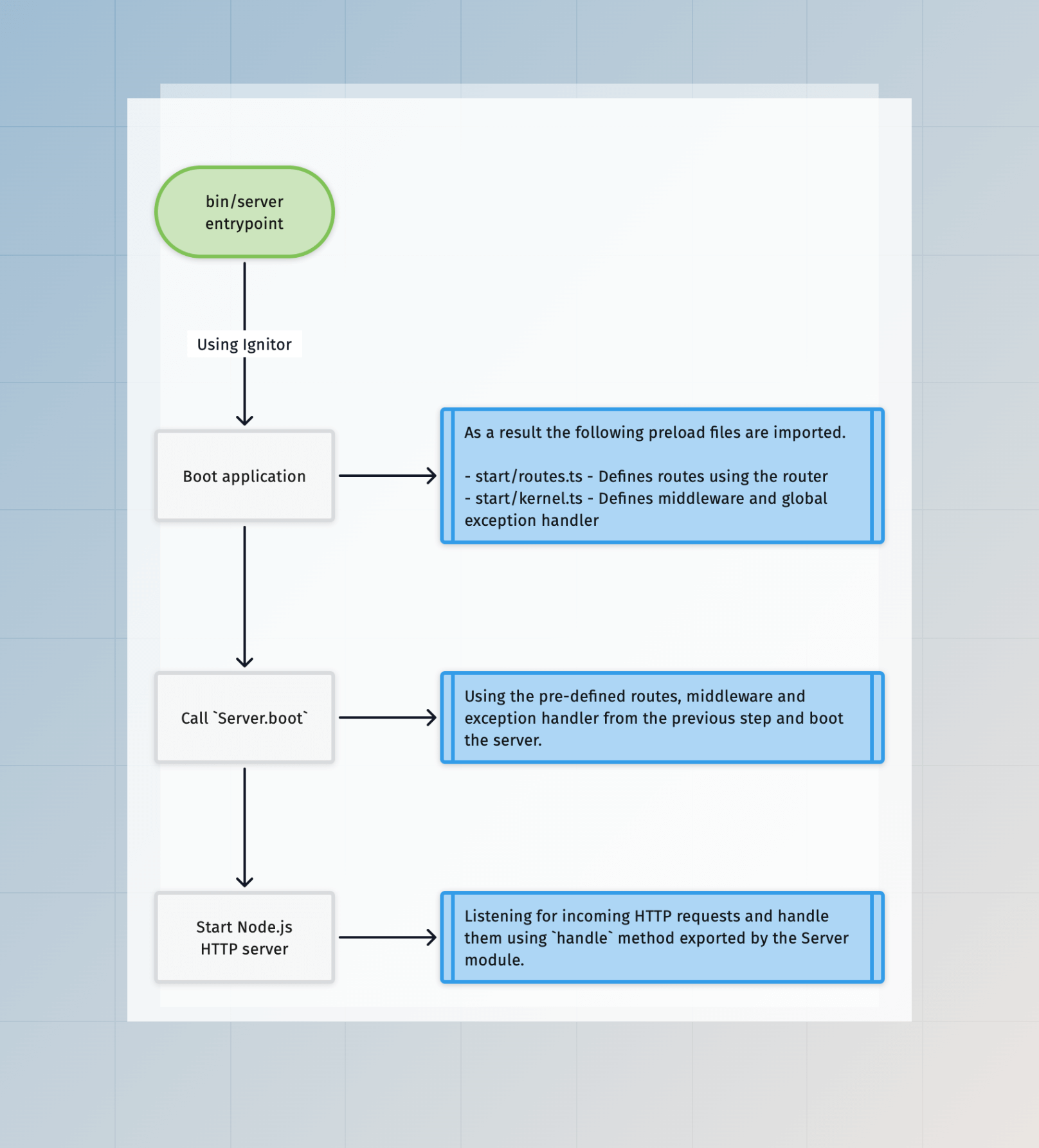 Also, it is essential to define the routes, middleware, and the global exception handler before the boot method is called, and AdonisJS achieves that using the start/routes.ts and start/kernel.ts preload files.
